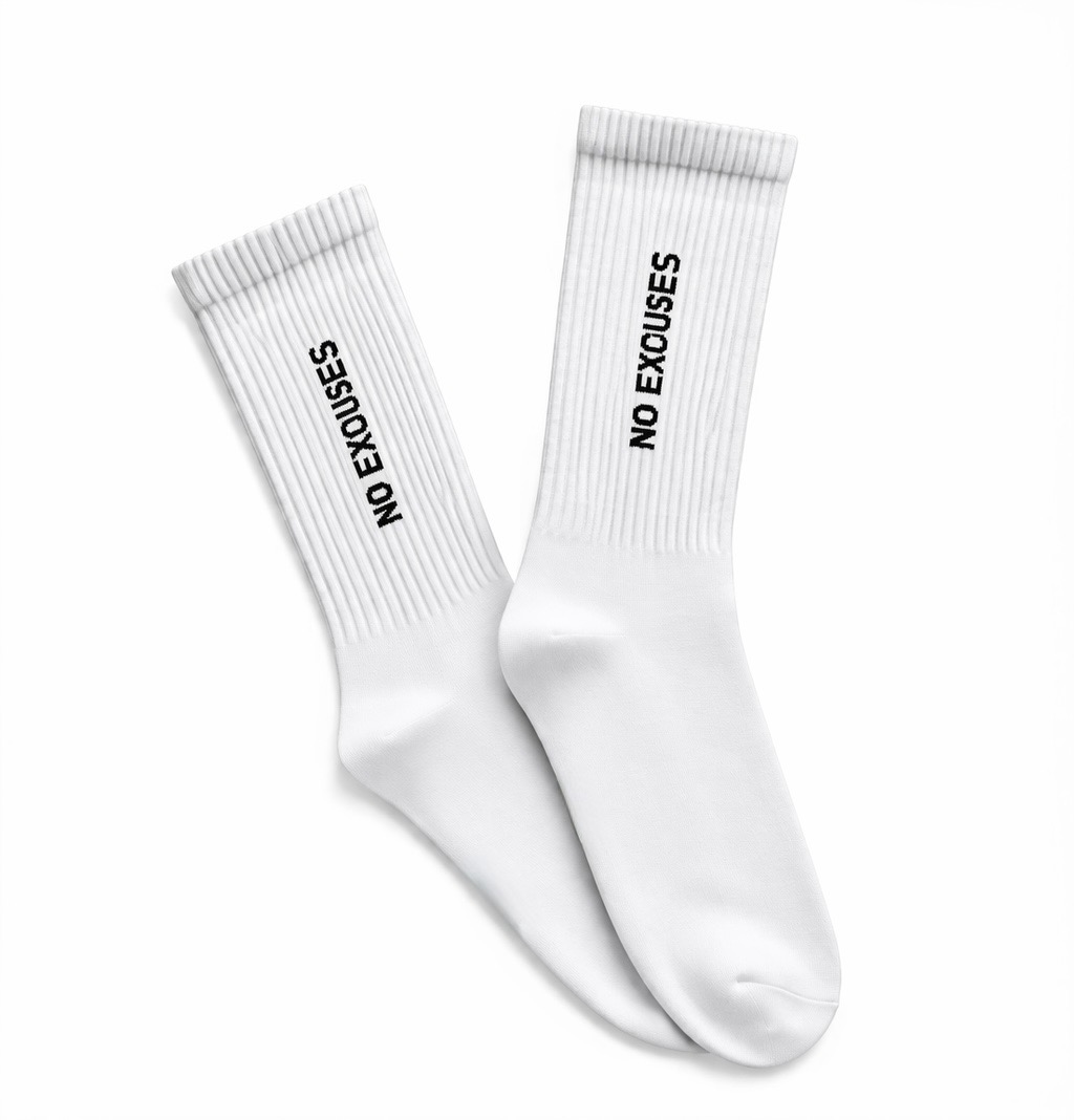Nasze białe ribowane skarpetki sportowe z motywującym napisem NO EXCUSES to idealny wybór dla osób, które stawiają na determinację, siłę i konsekwencję – zarówno w sporcie, jak i w codziennym życiu. Styl, wygoda i inspiracja w jednym!