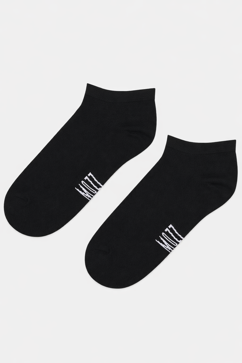 Klasyczne czarne stopki z napisem MOZZ pod stopą w kolorze białym.