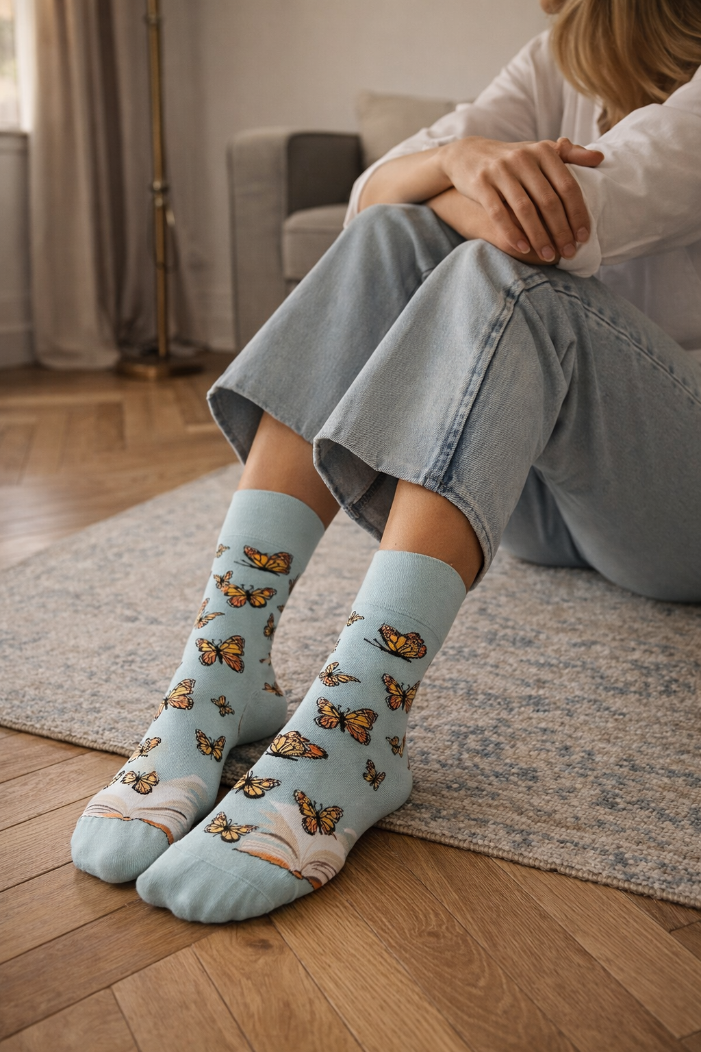 Kolorowe skarpetki błękitne z motywem książki i motyli.