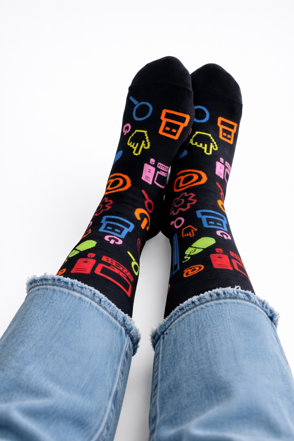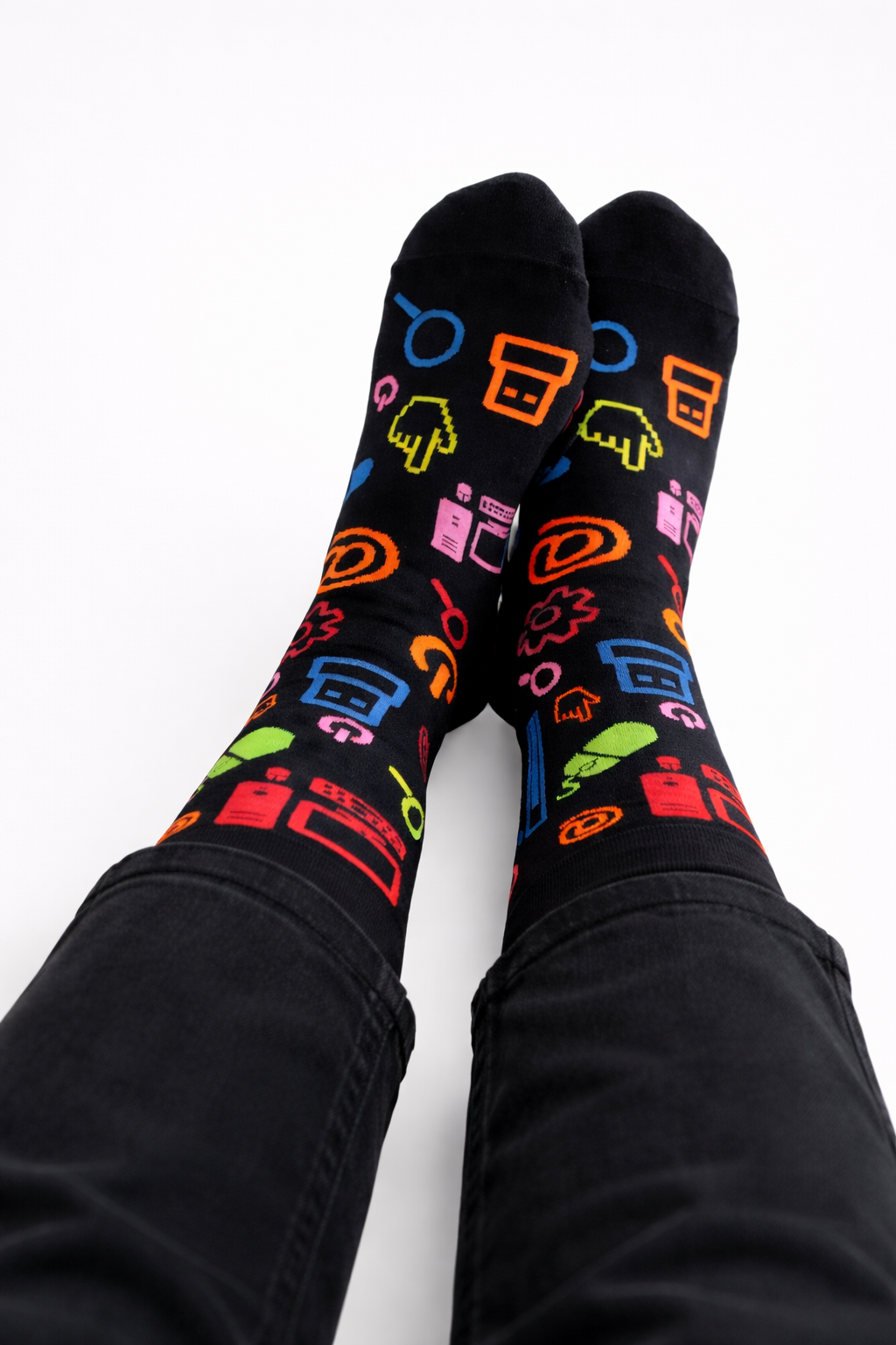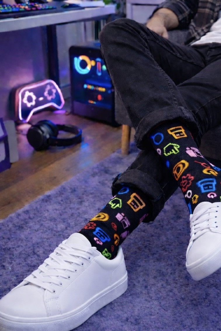 Cała skarpetka w kolorze czarnym z naniesionymi akcesoriami komputerowymi w żywych kolorach.
