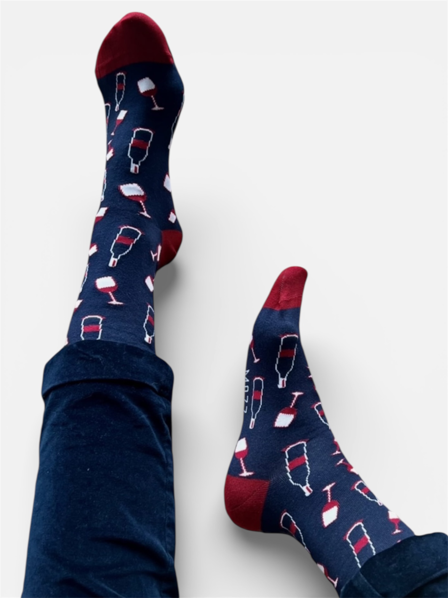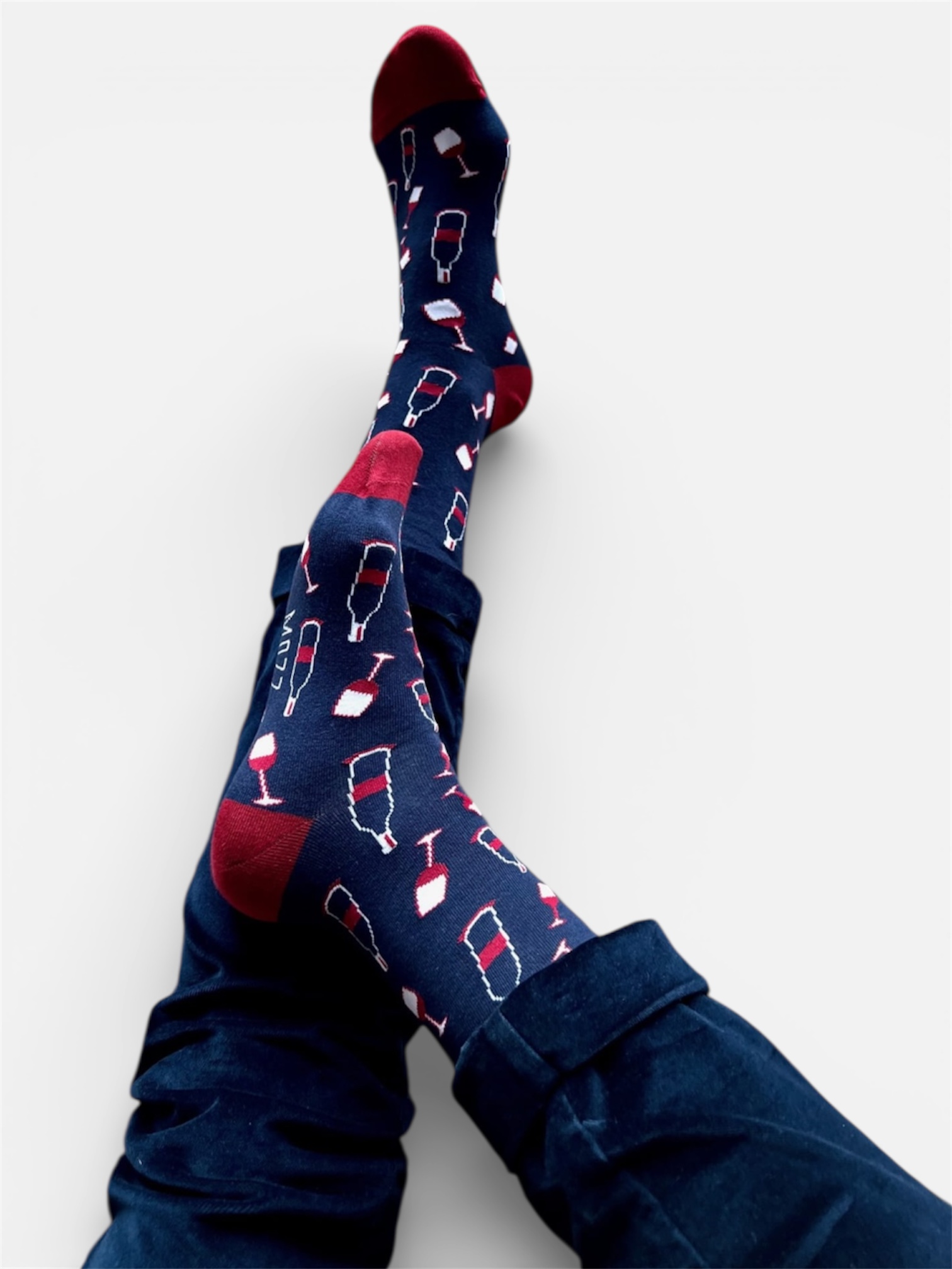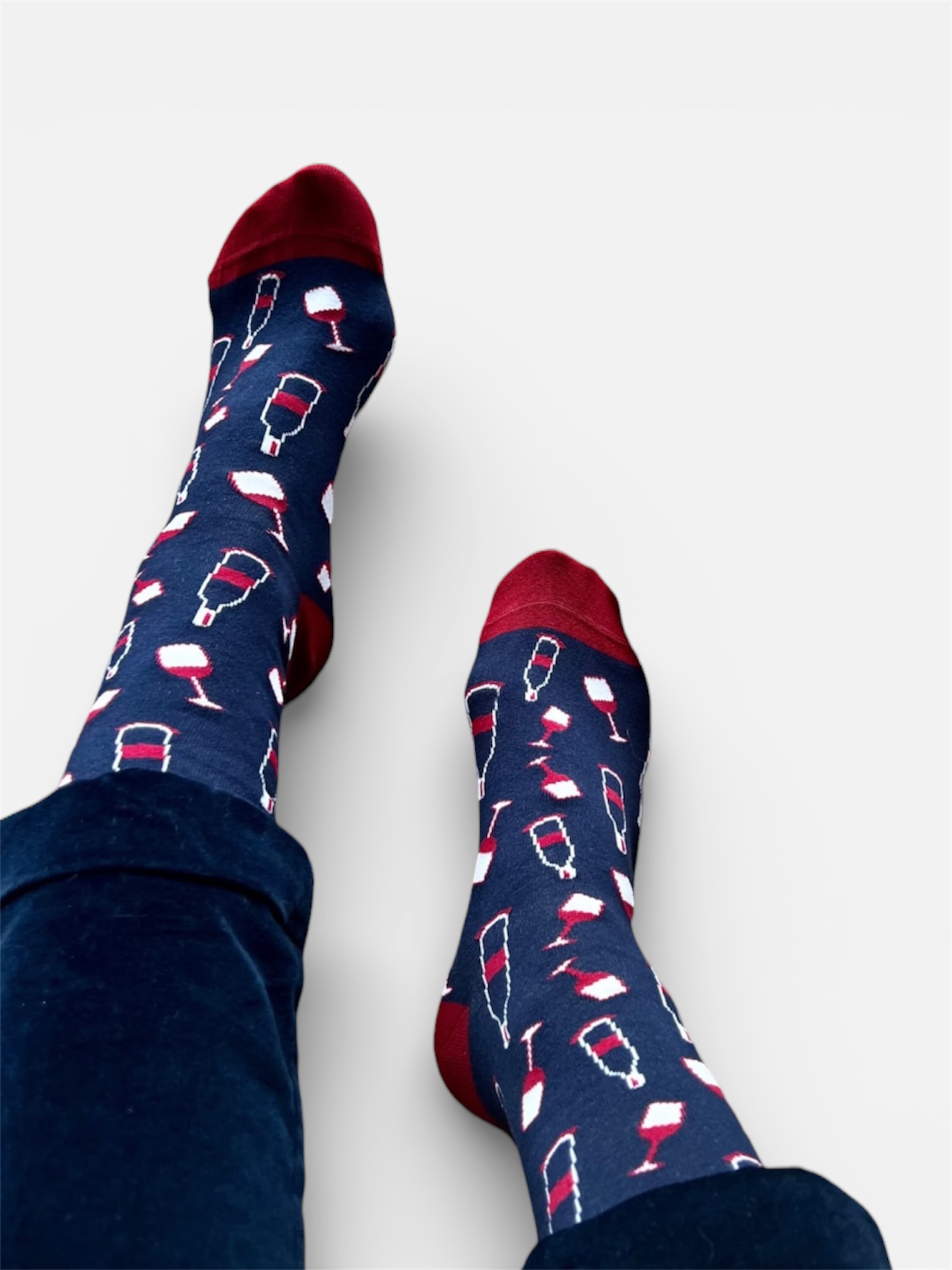 Kolorowe skarpetki granatowe w butelki i kieliszki wina