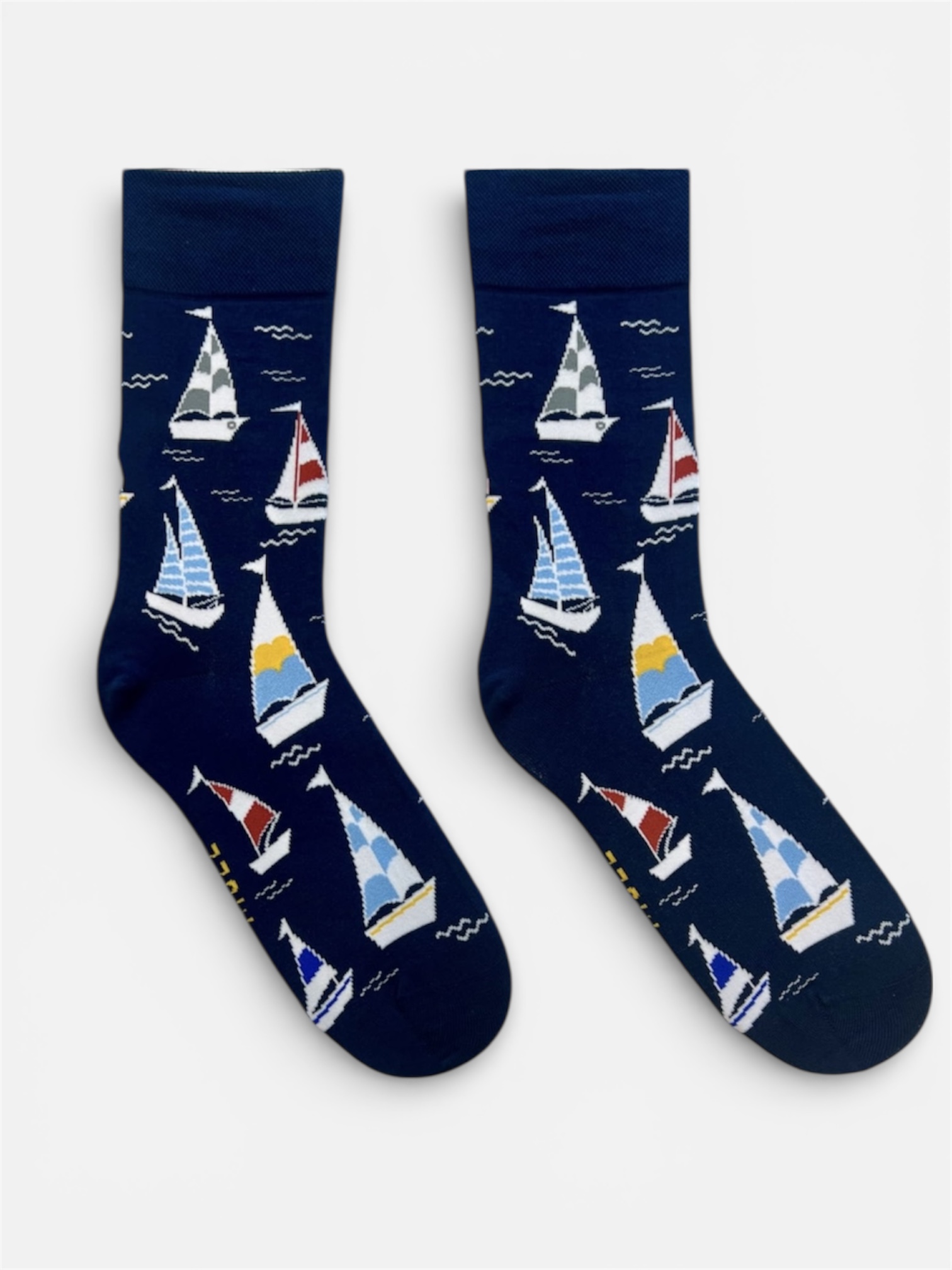 Wypłyń na modowe morze z naszymi skarpetkami ozdobionymi żaglówkami! Te kolorowe skarpetki przyniosą Twoim stopom odrobinę morskiej przygody, idealne na każdą wyprawę – nawet jeśli jest tylko do biura!