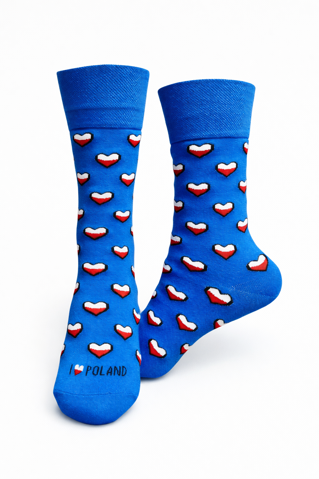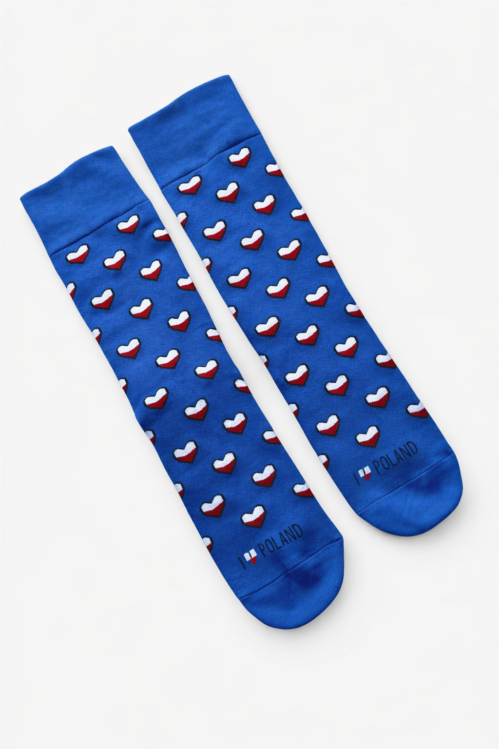 Kolorowe skarpetki niebieskie w biało czerwone serca I LOVE POLAND