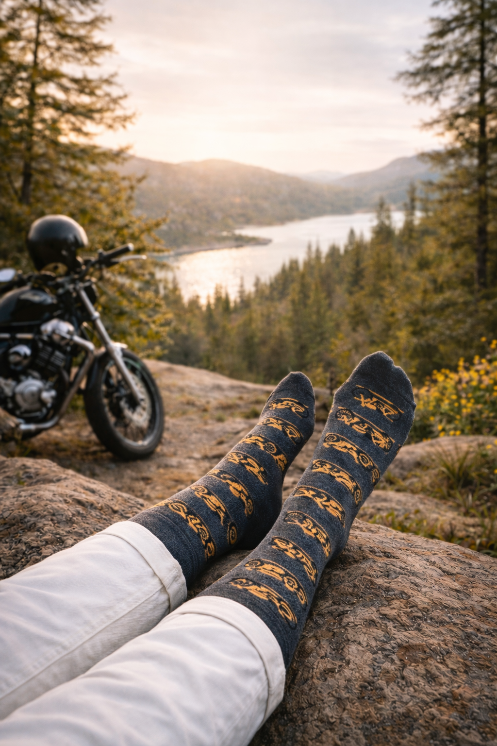 Szare skarpetki z motywem motocyklów.