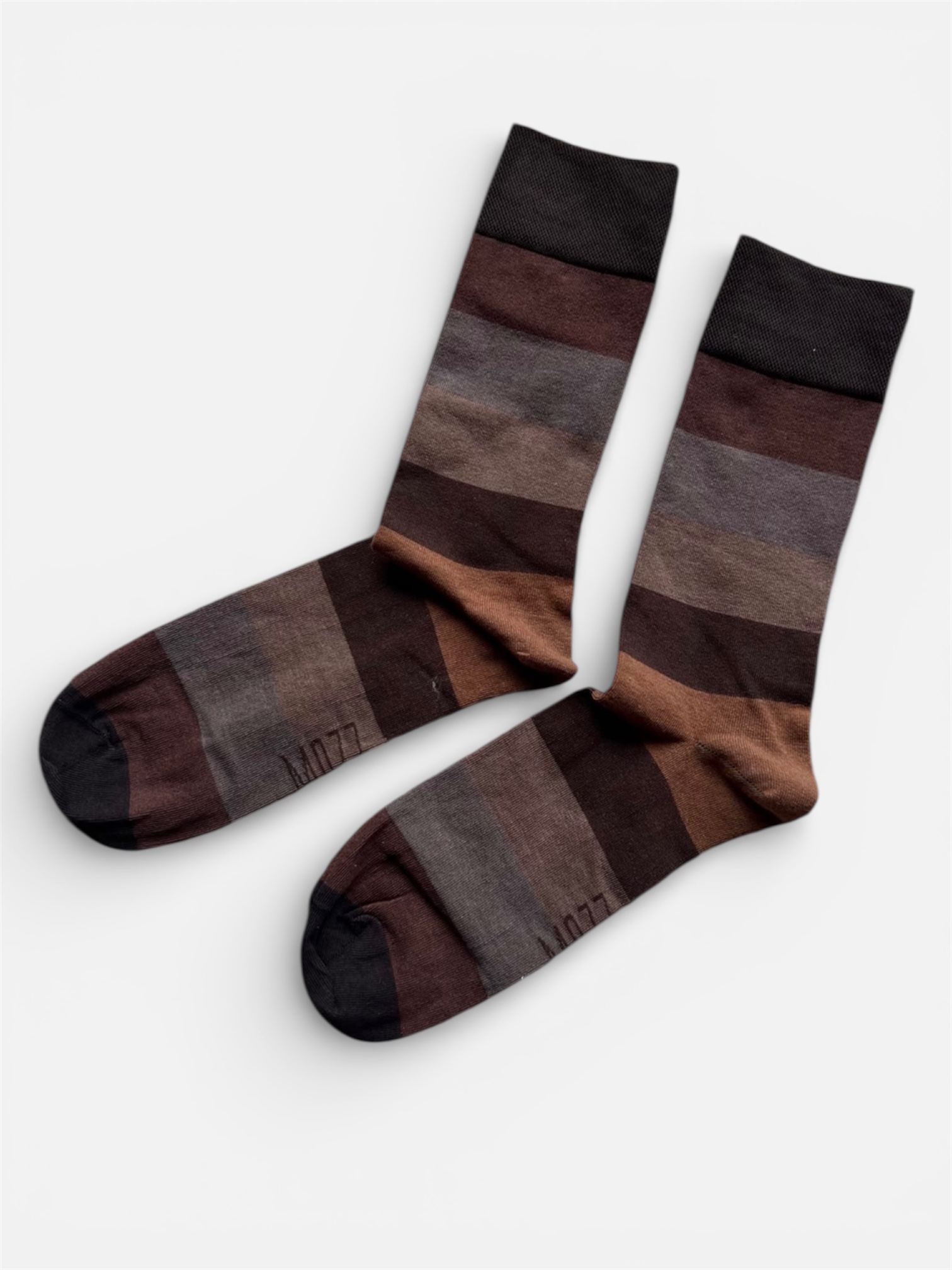 Kolorowe skarpetki w wielobarwne pasy w odcieniach brązowego.