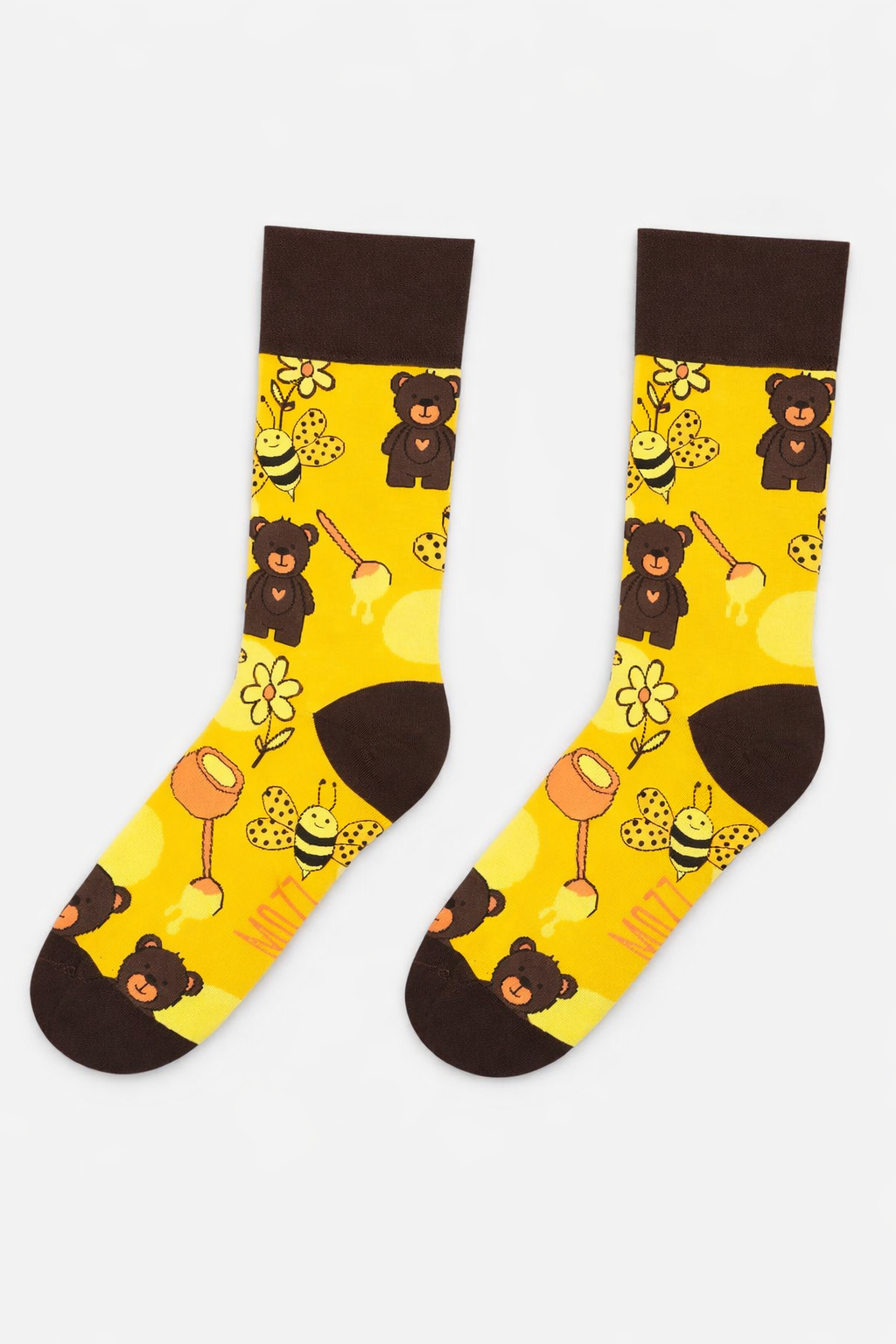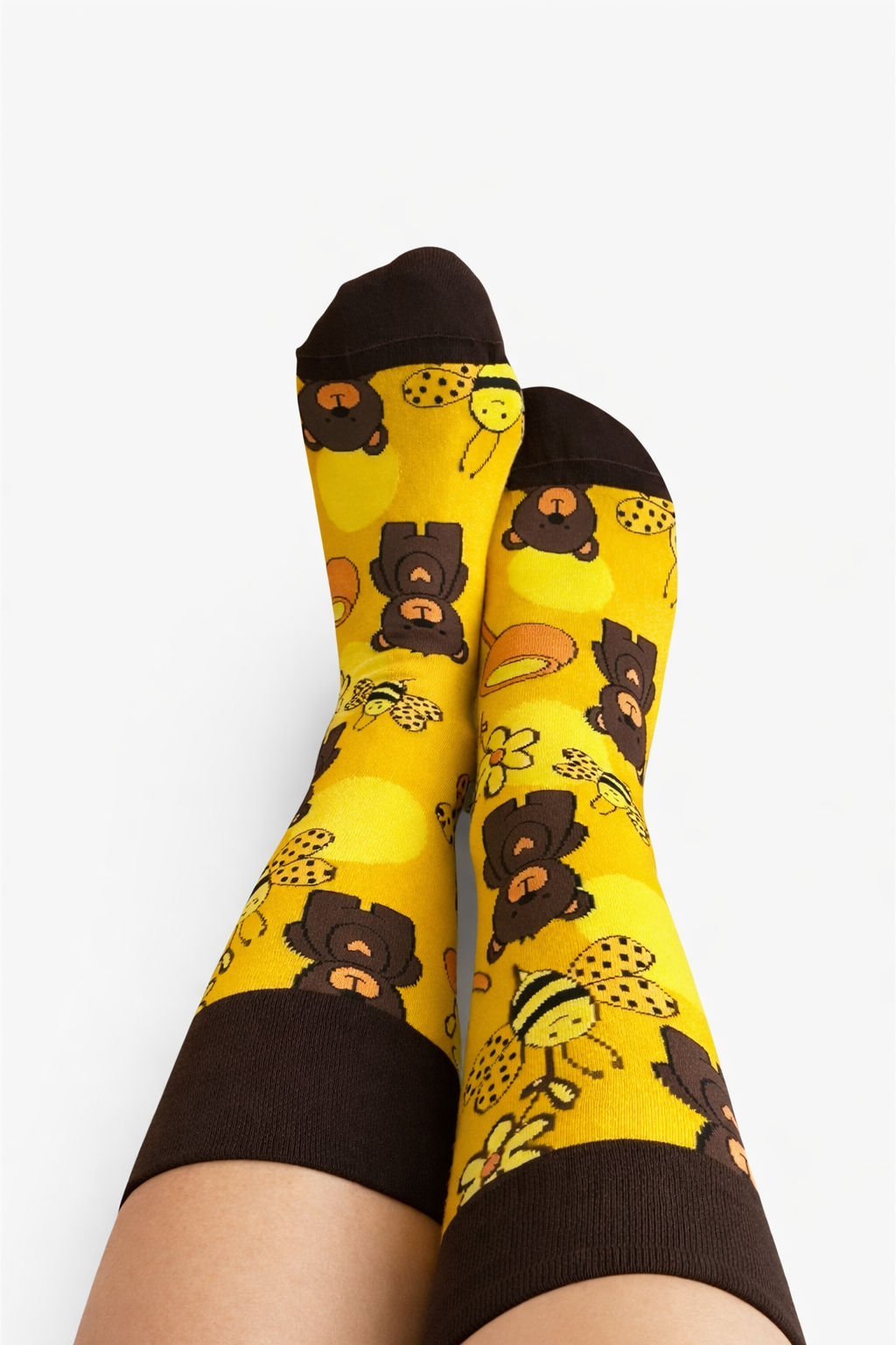 Żółte skarpetki z motywem misiów z pszczółkami.
