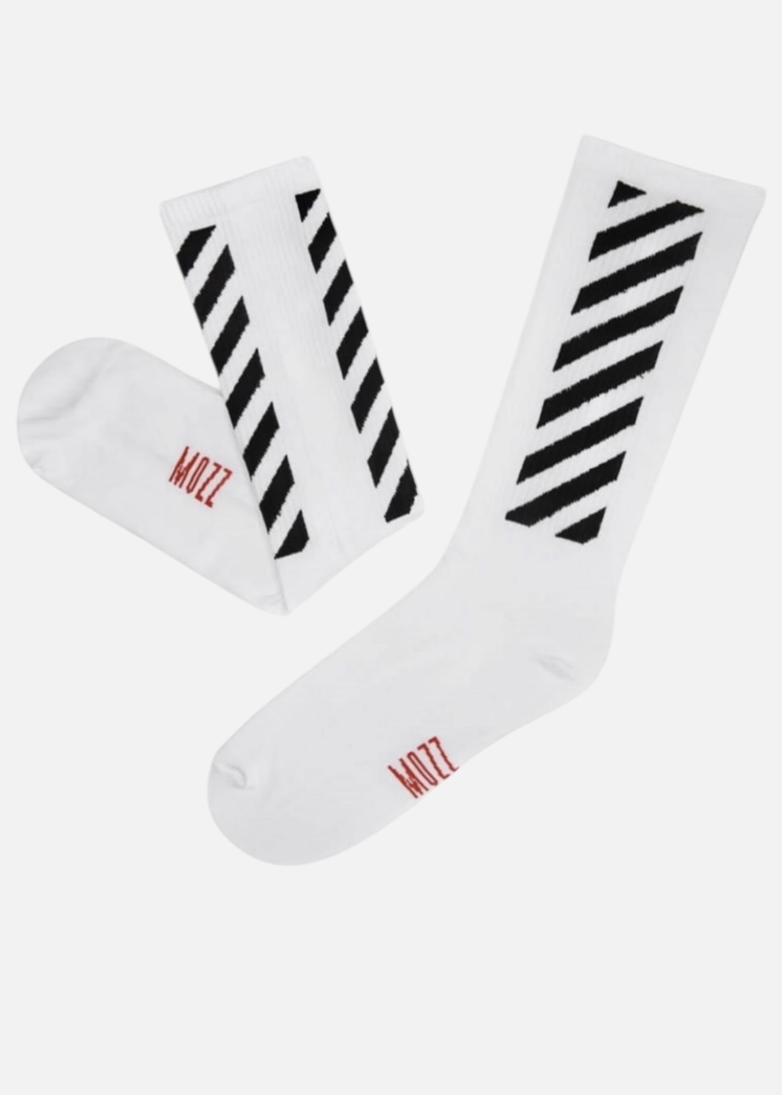 Białe sportowe wydłużone skarpetki z ribowanym ściągaczem. Ściągacz ozdobiony ukośnymi paskami w kolorze czarnym po obu stronach .