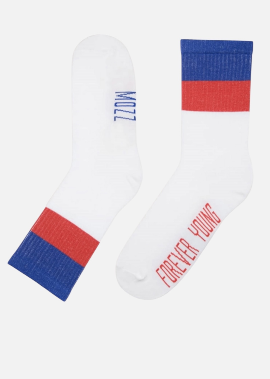 Sportowe skarpetki białe prążkowane z napisem Forever Young czerwono niebieskie paski