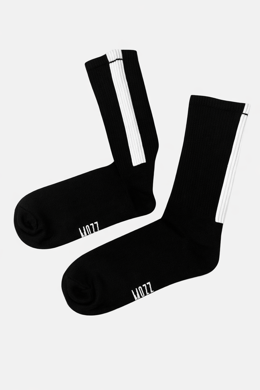 Czarne sportowe skarpetki z ribowane z czarnym paskiem. Ściągacz ozdobiony paskiem w kolorze białym.